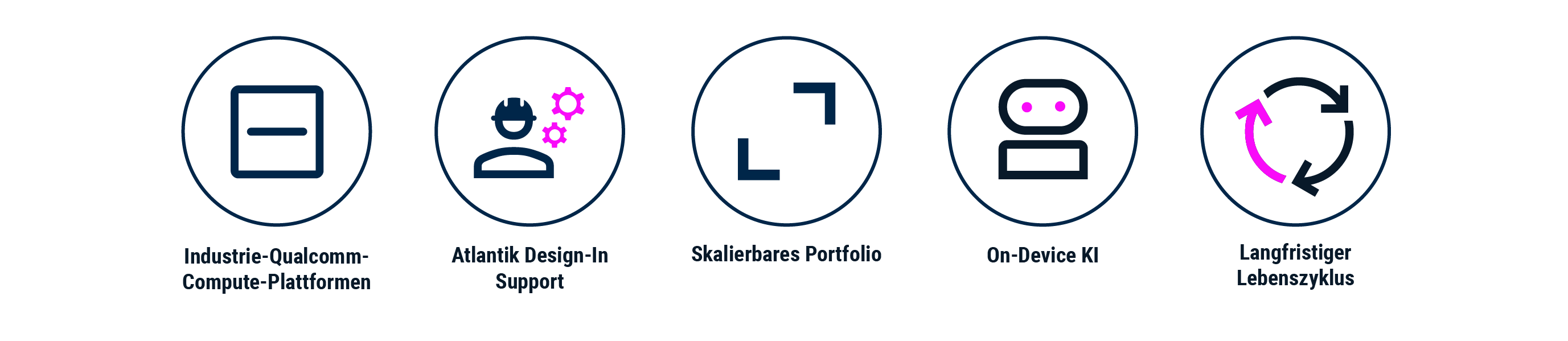 Im Zentrum unserer Lösungen stehen leistungsstarke Qualcomm Dragonwing™ IQ9-, IQ8- und IQ6-Plattformen für Sensorfusion, SLAM, Routenoptimierung und Edge Inference, die besonders für Leistungsaufnahme, thermische Grenzen und langfristige Verfügbarkeit optimiert sind. Für eine schnelle Integration und eine kürzere Time-to-Market ergänzt das Atlantik-Portfolio die Plattform-Roadmap durch modulbasierte Lösungen, evalautionsbereite Development Kits und Referenzdesings. Zur Vervollständigung des Autonomie-Stacks müssen auch Konnektivität, Sensorik, Speicher, Sicherheit und Kameras als zentral betrachtet werden.