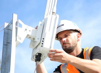 Der 5G-Breitbandadapter aus der W1855 Serie von Cradlepoint bietet branchenführende Wireless-WAN-Konnektivität für optimalen Signalempfang bei Außeninstallationen an Gebäuden und temporären Einsatzorten, die hohe Bandbreiten erfordern.