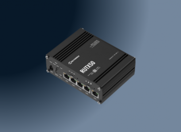 Der RUTX50 Router ist auf anspruchsvolle Umgebungen ausgelegt, arbeitet lüfterlos, unterstützt 9 bis 50 V DC Versorgung und deckt einen erweiterten Temperaturbereich ab.
