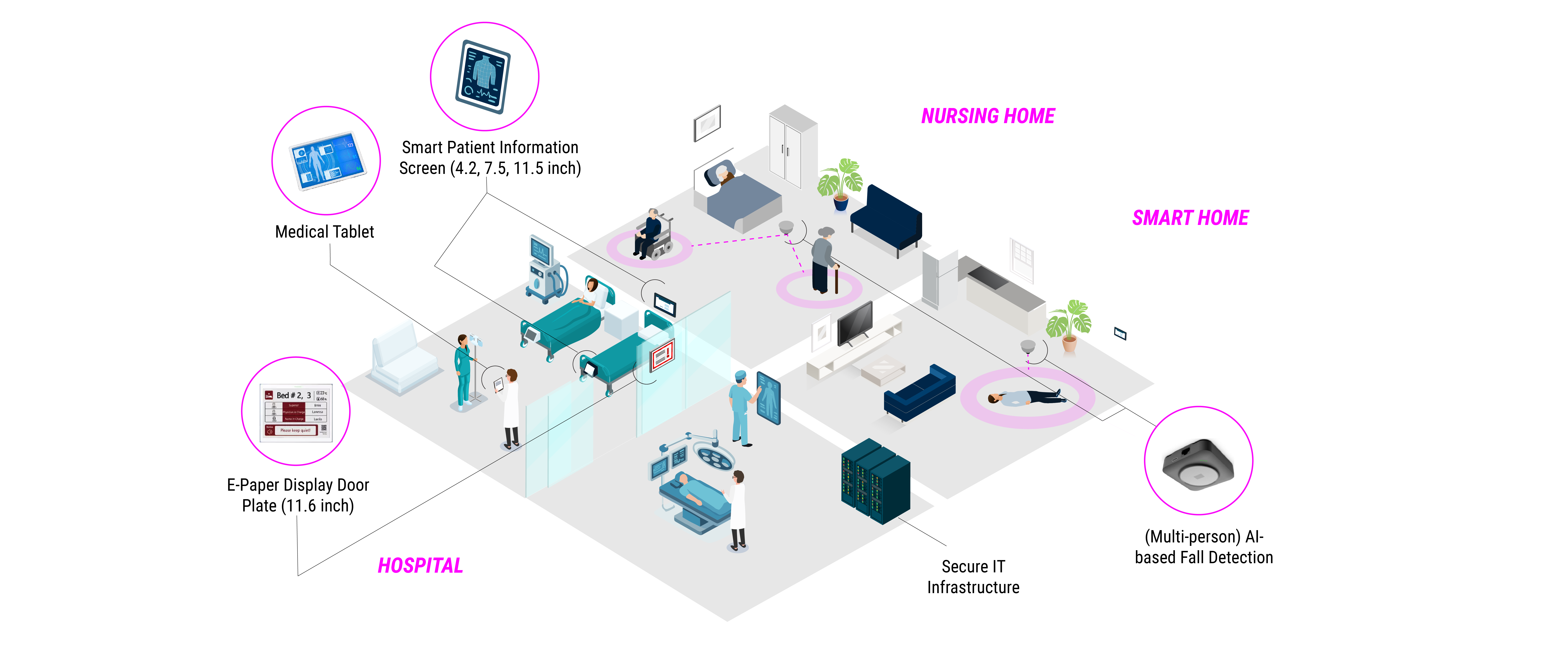 With an advanced AI-based fall detection system with multiple alert functions, e-paper information displays for real-time transmission of important patient data or room details, a customizable patient monitoring tablet for seamless information transmission and device control, as well as solutions for central IT- and Data Center efficiency, our Atlantik Elektronik portfolio encompasses a variety of advanced digital solutions and applications for an overall smarter care environment in hospitals, (nursing) homes, or for mobile care service organizations.
