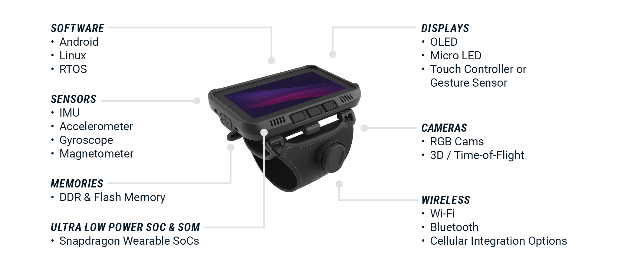 Depending on the respective requirements and tasks in logistics, production, maintenance, or quality control, compact wearable displays are available in various formats, ranging from classic, compact smartwatches to slightly larger wrist computers, AR-enabled data viewers, and robust wearable terminals. These wearables can be powered by energy-efficient Snapdragon® processors by Qualcomm Technologies and equipped with various features for secure usability in specific application areas.